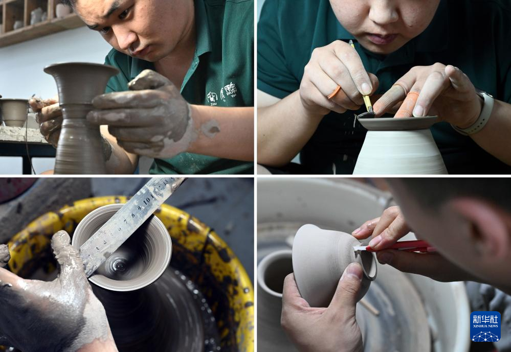 工作人员在河南省禹州市驺虞窑的工作室里进行钧瓷手工拉坯制作(拼版照片,7月2日摄)。