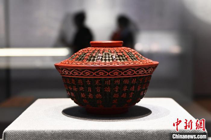 8月1日,正在展出的剔红题乾隆御制三清茶诗盖碗。近日,“故宫·茶世界:紫禁清韵——茶文化精品文物展”亮相位于石家庄的河北博物院。该展览由故宫博物院、河北博物院联合主办,是“故宫·茶世界”全球巡展的第二站。本次展览由“宫中佳茗”“乾隆与茶”“茶事源流”和“茶香燕赵”四个单元组成,汇集了故宫博物院、河北博物院、中国茶叶博物馆三馆珍藏的160件(套)文物与相关史料。中新社记者 翟羽佳 摄