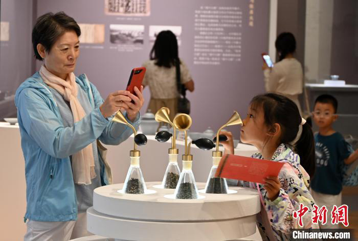 8月1日,小朋友试闻茶的味道。近日,“故宫·茶世界:紫禁清韵——茶文化精品文物展”亮相位于石家庄的河北博物院。该展览由故宫博物院、河北博物院联合主办,是“故宫·茶世界”全球巡展的第二站。本次展览由“宫中佳茗”“乾隆与茶”“茶事源流”和“茶香燕赵”四个单元组成,汇集了故宫博物院、河北博物院、中国茶叶博物馆三馆珍藏的160件(套)文物与相关史料。中新社记者 翟羽佳 摄